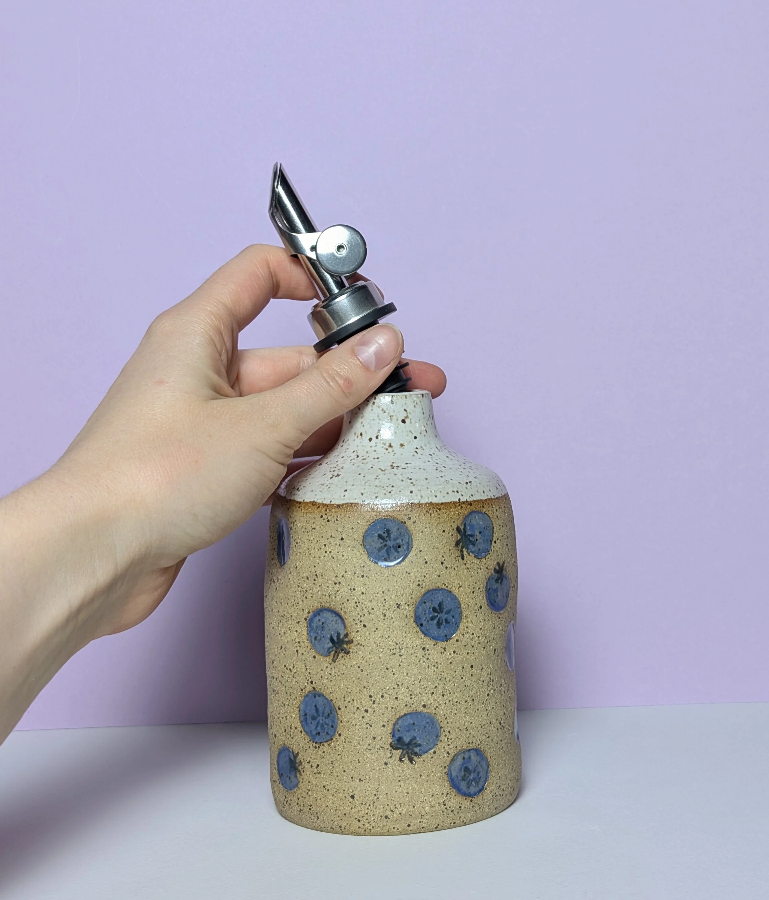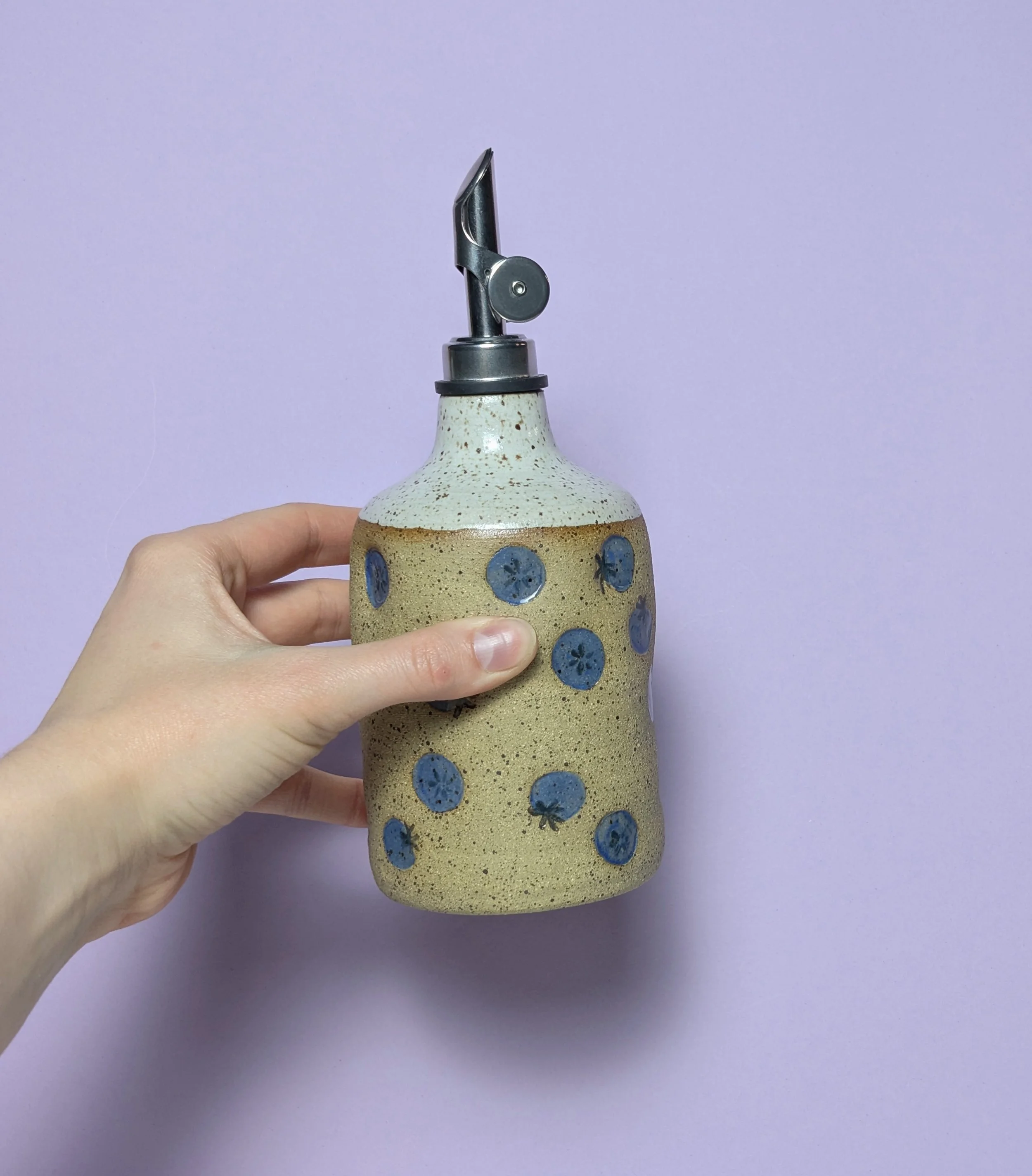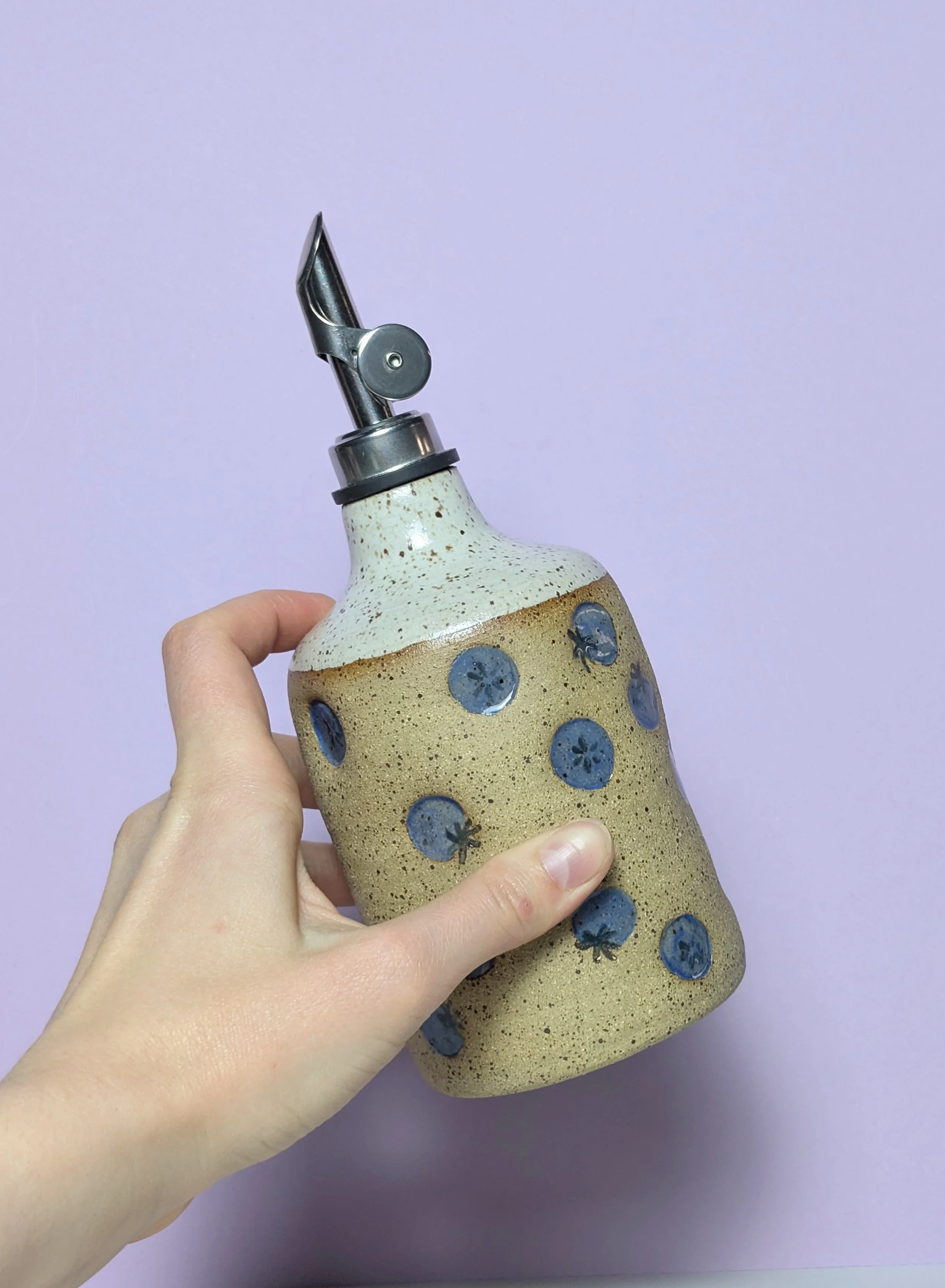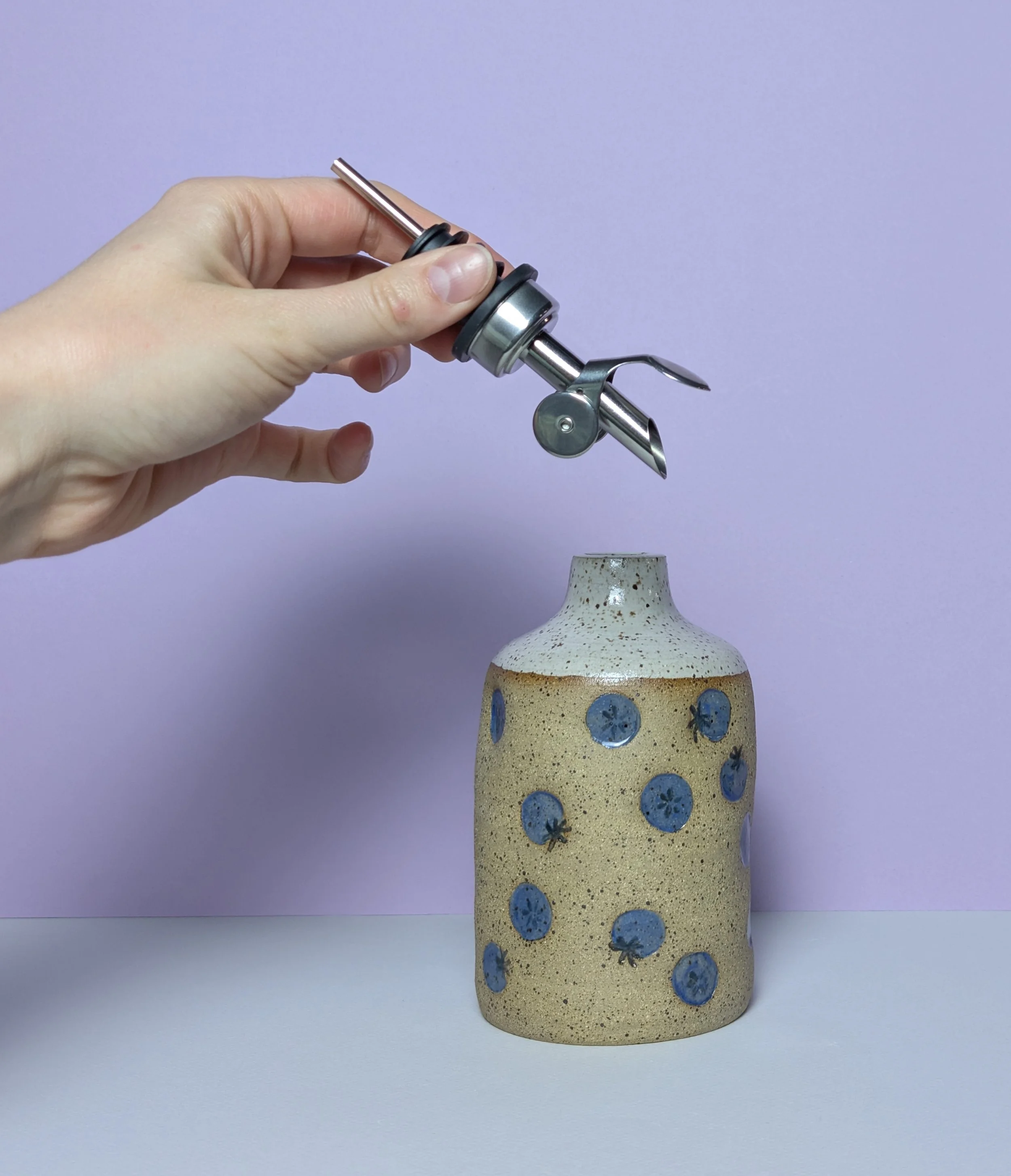 This oil cruet, or oil jug, or oil pourer (whatever you want to call it) was thrown on the wheel and then hand stamped with my two blueberry stamps. The blueberries are glossy glazed and the rest of the exterior is the raw clay, which is great for gripping. The interior and top are glazed a glossy white. The hardware on this, the oil spout, is metal and rubber and creates a nice seal.